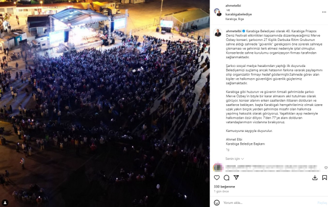 Instagram hesabından yaptığı paylaşımında konsere gelen vatandaşların mağdur olduğunu söyleyen Elbi, Merve Özbey’i hedef alarak şunları söyledi: “Karabiga Belediyesi olarak 40. Karabiga Priapos Deniz Festivali etkinlikleri kapsamında düzenleyeceğimiz Merve Özbey konseri, şarkıcının 27 Kişilik Darbuka Ritim Grubunun sahne aldığı sahnede ‘güvenlik’ gerekçesini öne sürerek sahneye çıkmaması ve şehrimizi terk etmesi nedeniyle iptal olmuştur. Konserlerde sahne kurulumu organizasyon firması tarafından sağlanmaktadır. Şarkıcı sosyal medya hesabından yaptığı ilk duyuruda Belediyemizi suçlamış ancak hatasının farkına vararak paylaşımını silip organizatör firmayı hedef göstermiştir. Sahnede görev alan kişiler ve halkımızın güvenliğini güvenlik güçlerimiz sağlamaktadır.”